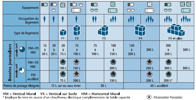 La capacité du chauffe-eau doit être choisie en fonction du nombre de pièces, des équipements présents (nombre d’éviers, baignoire, douche…) et du nombre de personnes occupant le logement.