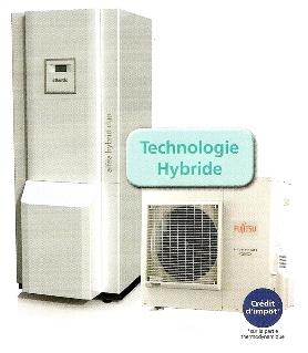 Cette gamme de pompe à chaleur inverter couple une pompe à chaleur aérothermique avec une chaudière fioul de 25kW tout en intégrant un ballon d’eau chaude sanitaire et ceci dans un même habillage.