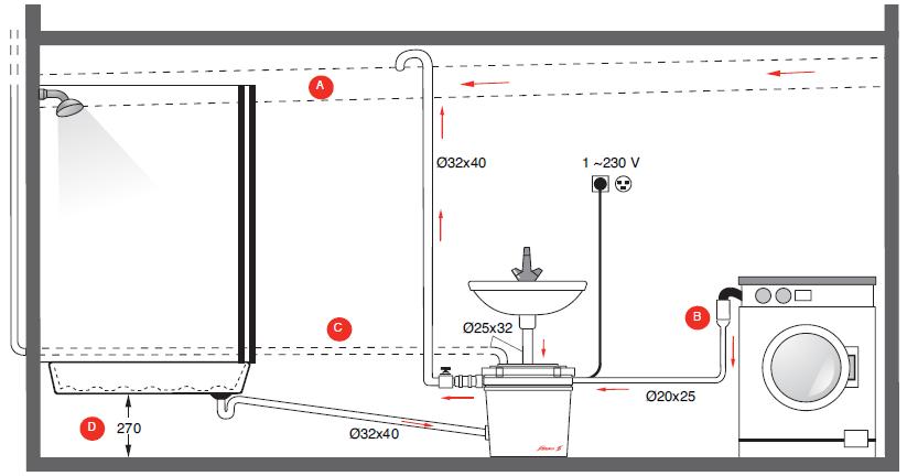 Relevage des eaux usées domestiques en provenance de lavabo, lave-linge, cabine de douche… Relevage d’eaux usées sans matières grasses ni matières fibreuses. A proscrire sur utilisation d’eaux chargées, de matière fécales, en provenance de W.C. Idéal pour aménager en sous-sol une deuxième salle d’eau.